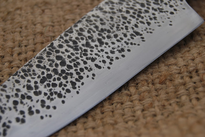 Głownia młotkowana dla uzyskania odpowiedniej faktury, przypominającej tsuchime. Pozostawiona odrobina zendry po hartowaniu.