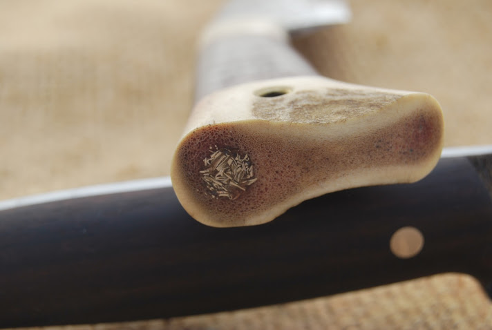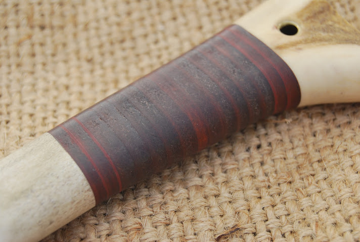 Na oprawę użyłem poroże jelenia, skórę, bordową fibrę i odrobinę mosiądzu.