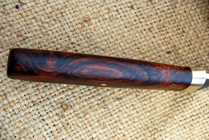 Garda z mosiądzu, przekładka z bordowej fibry i rękojeść z cocobolo.