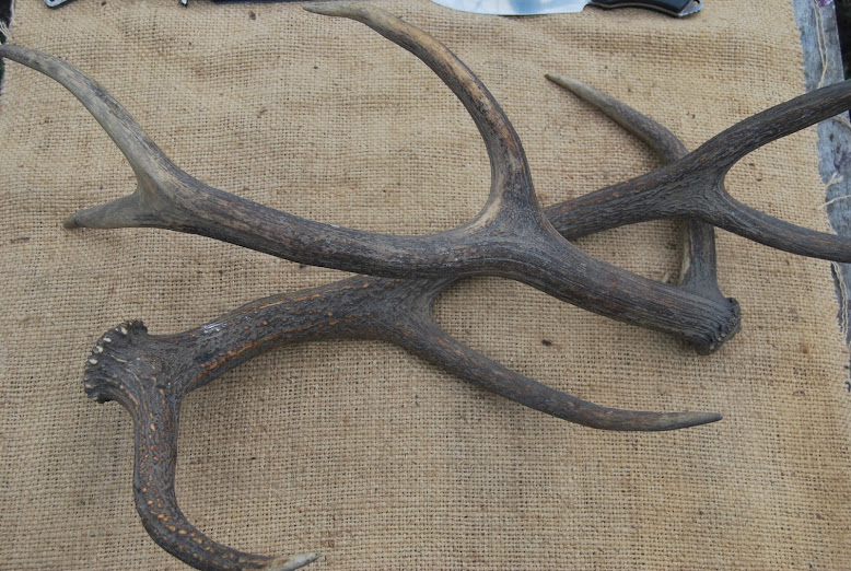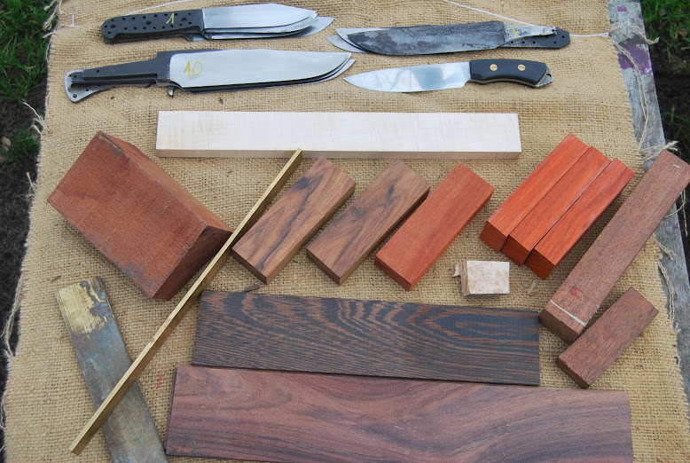 Kawałki poroża jelenia, bloczki padouka, palisandru bodajże santos, merbau, twardego mahoniu, okładki palisandrowe sonokeling, klonu pasiastego, wenge oraz mosiądz na gardy - 5 i 10 mm.