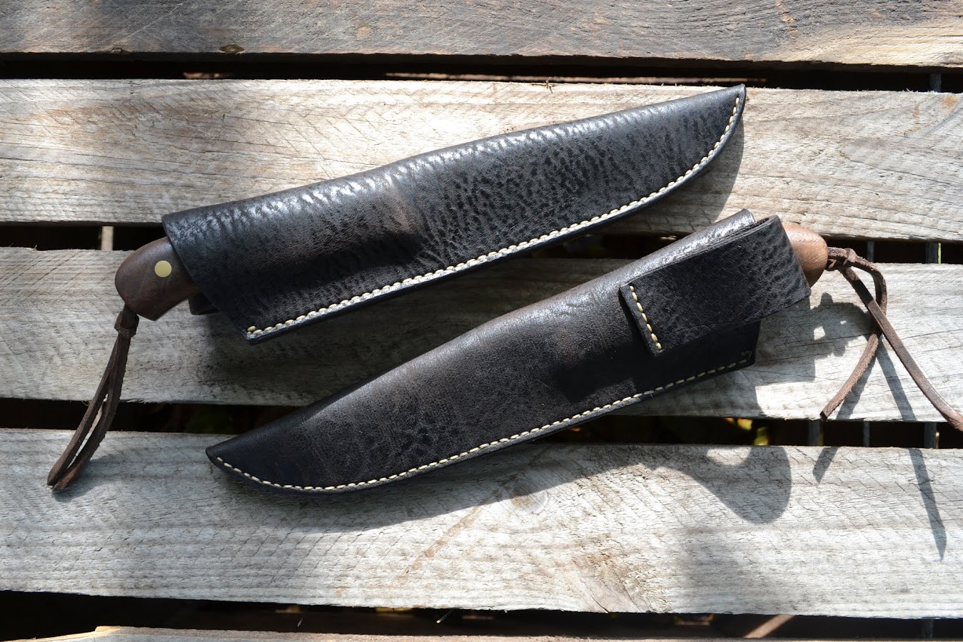 Pochewki identyczne, w odróżnieniu od noży, które różnią się detalami, skórzane, woskowane na wskroś, szyte beżowym Slamem.